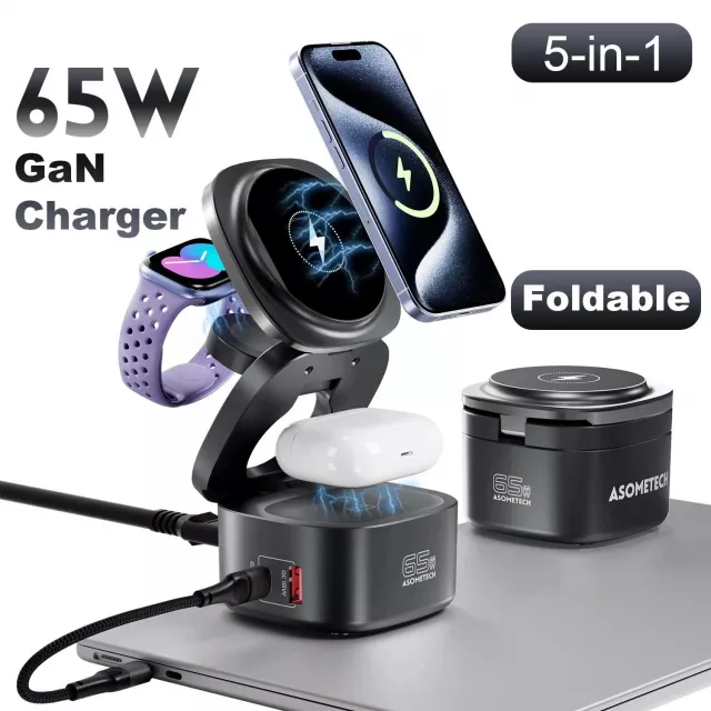 65W GaN 5-in-1 Magnetic Wireless Charging Station with Foldable Design