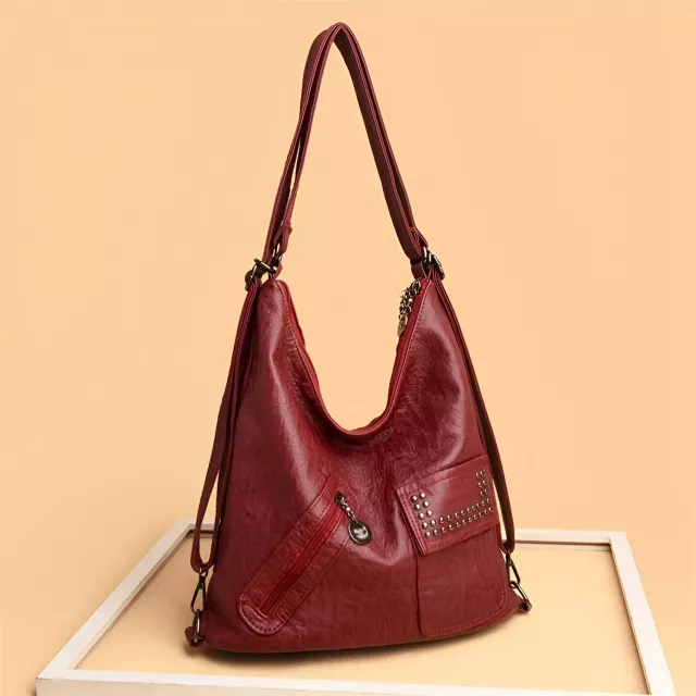 The tote features a casual yet refined shape that complements any outfit – from everyday jeans to elegant dresses. The soft leather texture adds a touch of class, while the rivet detailing gives it a modern edge. Its secure zipper and hasp closure ensure your essentials stay safe, and the spacious interior offers enough room for your iPad, phone, wallet, and more. Lined with durable polyester, it’s built to last while maintaining its chic appeal.