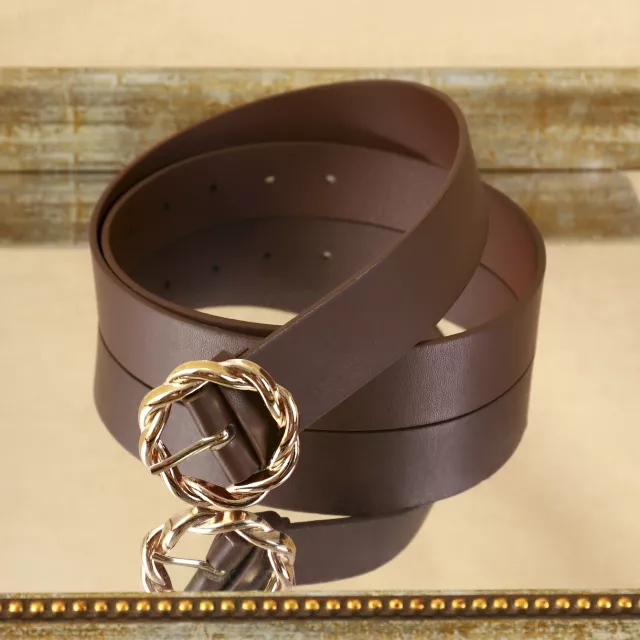 Transform your outfit in seconds with this fashionable, coffee-colored belt with a gold braided buckle. A must-have piece for any woman who loves combining simplicity with elegance. Add it to your wardrobe and let every outfit shine with effortless sophistication.